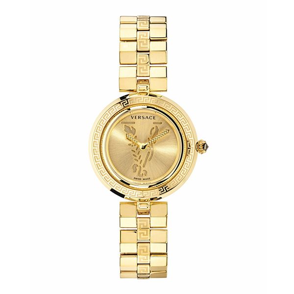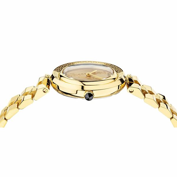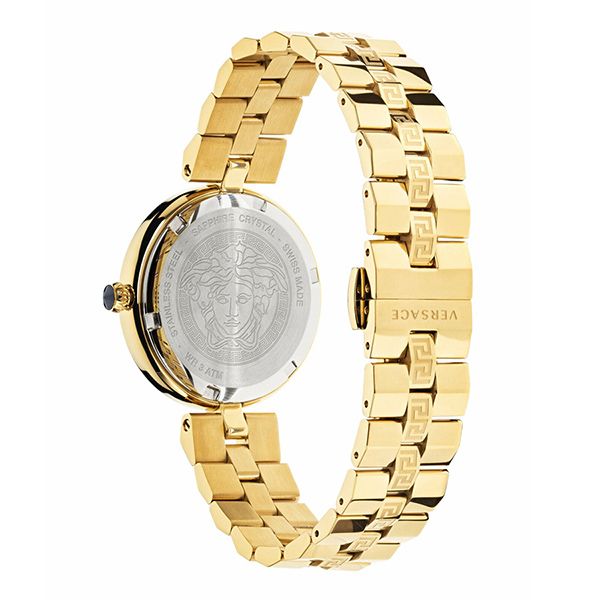 Bao quanh mặt số là viền mạ gold khắc họa tiết Greca trứ danh – một trong những biểu tượng mang tính di sản của Versace. Họa tiết Greca đại diện cho sự vĩnh cửu và quyền lực, giúp Virtus Infinity không bị nhầm lẫn với bất kỳ mẫu đồng hồ thời trang nào khác trên thị trường.